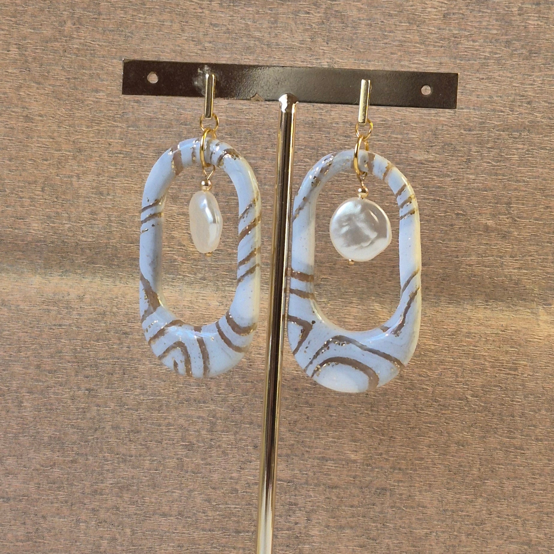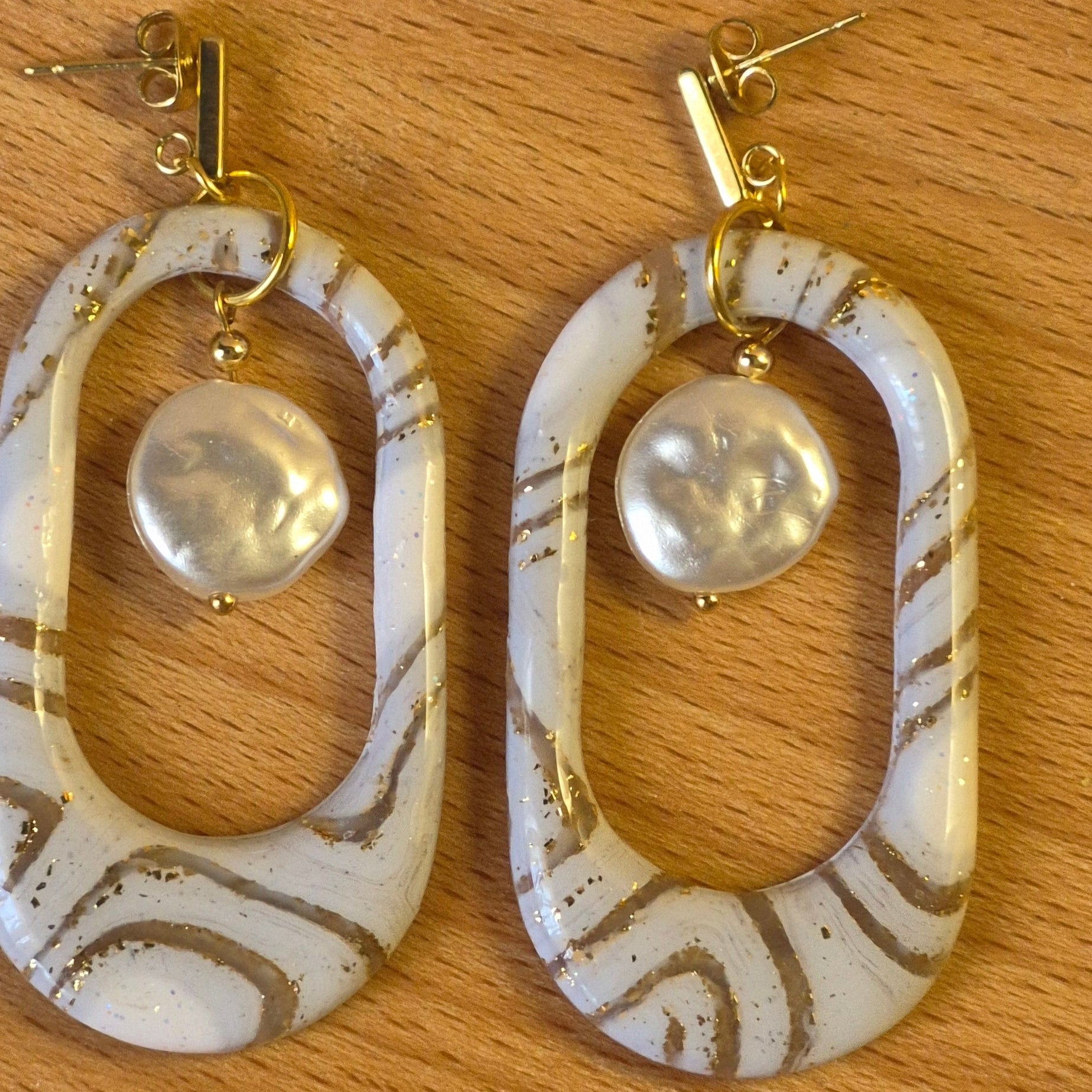 Los pendientes “Aurora” están diseñados en arcilla polimérica con un elegante efecto marmolado en tonos blanco y dorado. Su forma ovalada, combinada con un delicado colgante en forma de perla sintética, crea un contraste perfecto entre lo moderno y lo clásico.