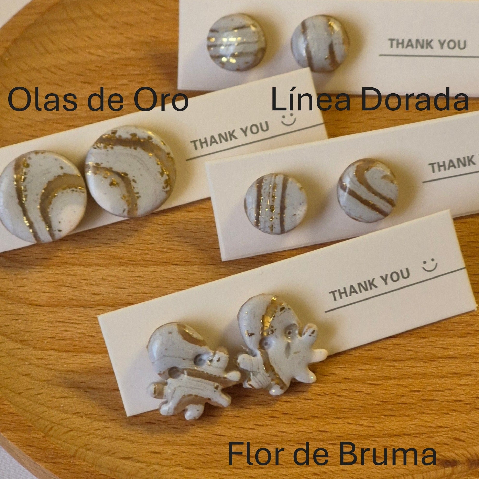 Pendientes de arcilla polimérica, con diseño minimalista en tonos grises y vetas doradas que aportan un toque elegante y sofisticado. Súper ligeros, hechos a mano y únicos, perfectos para looks diarios o eventos especiales.