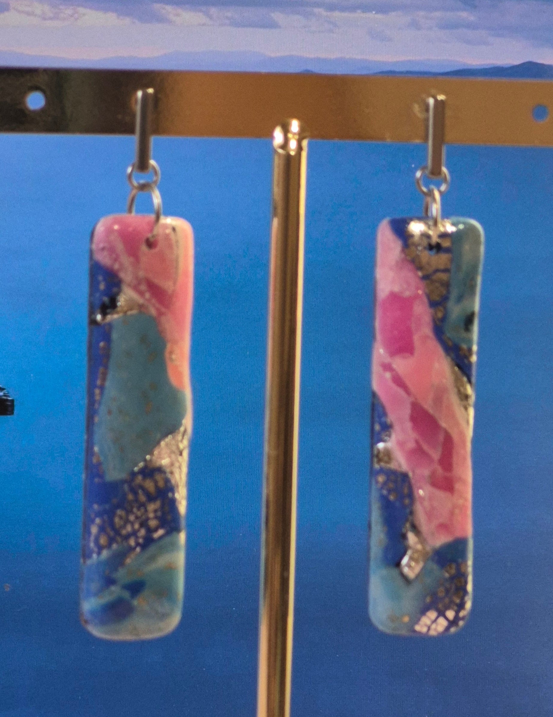 Pendientes artesanales elaborados en arcilla polimérica, con una fusión única de tonos azules intensos, rosa suave y toques plateados, evocando la belleza del mar y el cielo al amanecer. Cada pieza está hecha a mano, por lo que cada diseño es único e irrepetible.