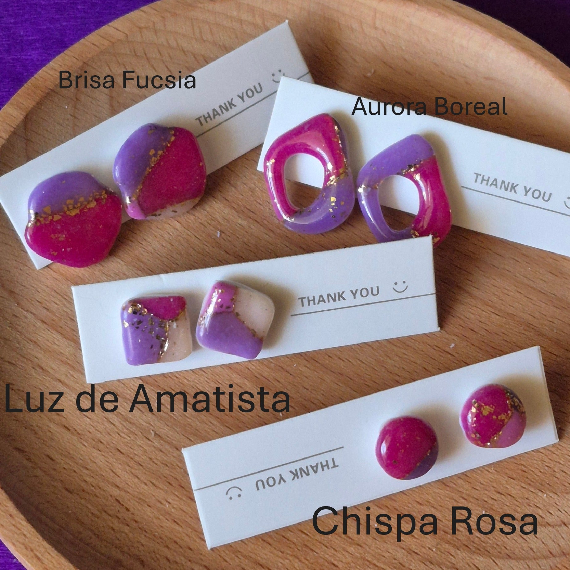 La Colección Aurora está inspirada en la fusión de colores vibrantes que evocan los cielos al amanecer. Tonos fucsias y violetas se mezclan con delicados destellos dorados, creando piezas únicas que transmiten energía, feminidad y elegancia contemporánea. Cada par de pendientes está hecho a mano en arcilla polimérica, con acabados brillantes que realzan su estilo moderno y artístico.