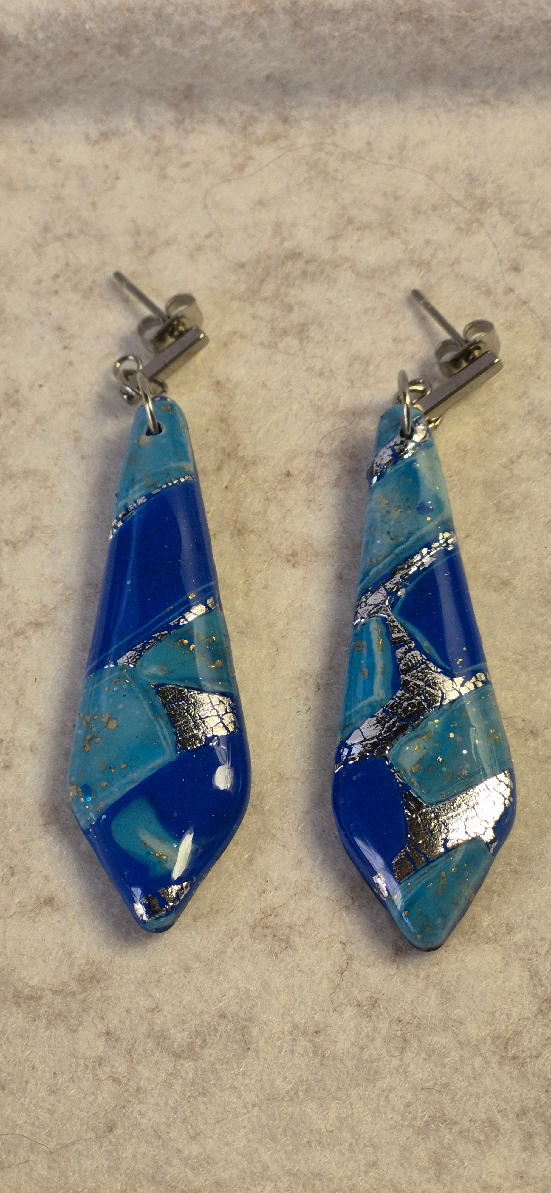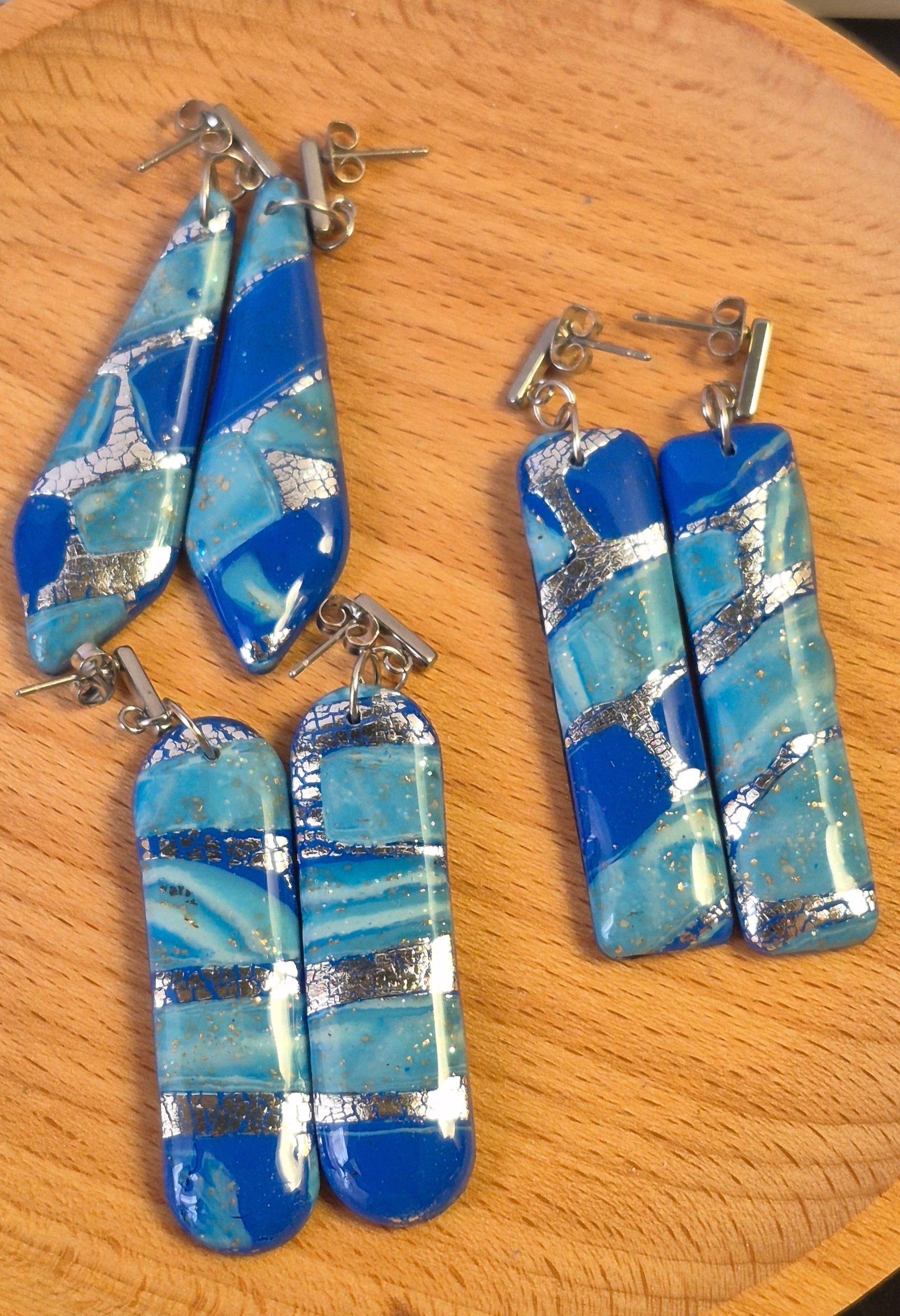Inspirados en la luz que baila sobre las olas, los pendientes “Destellos de Mar” son una pieza elegante y contemporánea. Están hechos a mano con arcilla polimérica en una forma de gota angular, combinando tonos de azul intenso, celeste y detalles en pan de plata que aportan brillo y textura.