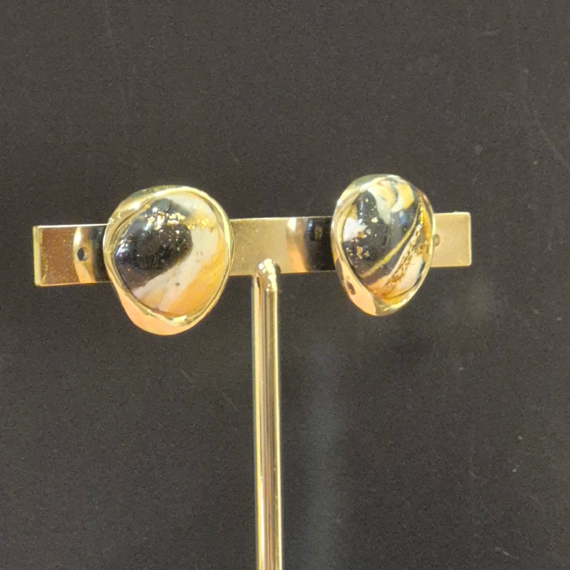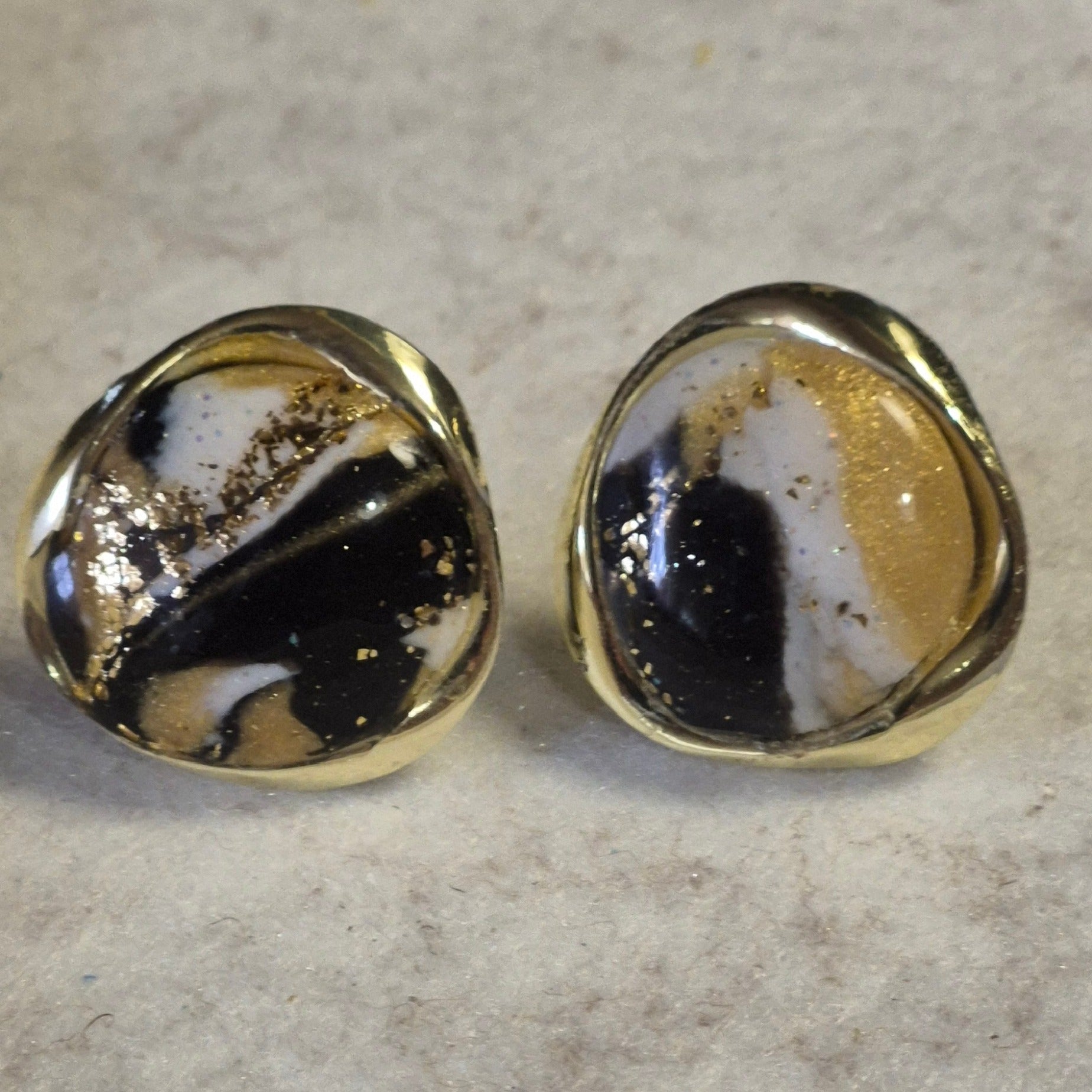 Pendientes de botón hechos a mano en arcilla polimérica, con un diseño marmoleado en negro, blanco y dorado que recuerda las dunas iluminadas por la luz dorada del atardecer africano. Cada pieza está enmarcada con un delicado borde dorado que realza su elegancia y sofisticación. Su tamaño pequeño los hace perfectos para el uso diario, añadiendo un toque de estilo inspirado en la naturaleza salvaje.