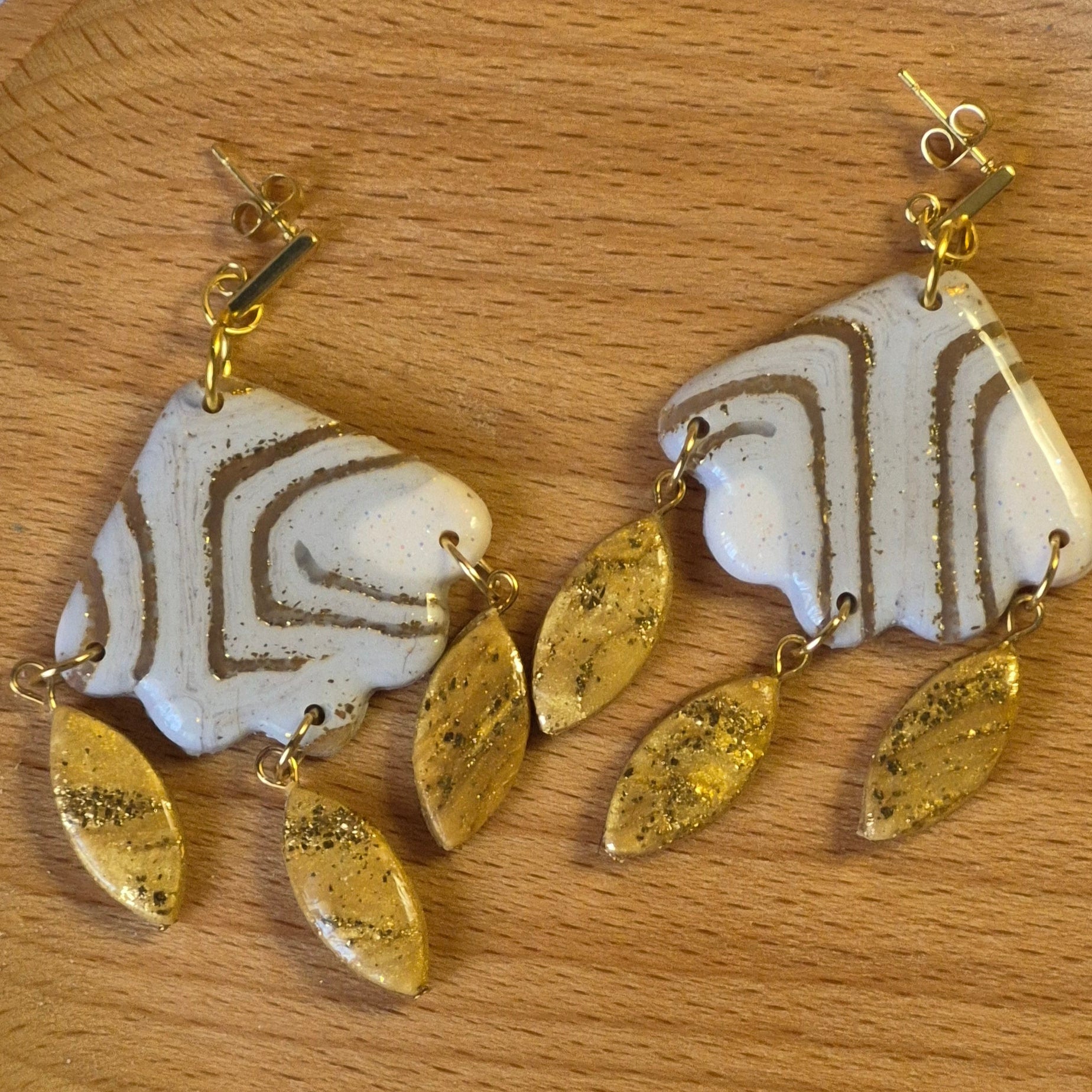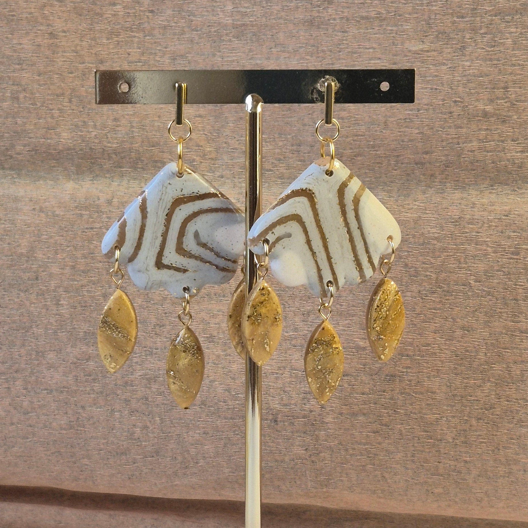 Pendientes hechos a mano en arcilla polimérica con diseño marmoleado en tonos tierra y detalles dorados. Cuentan con colgantes en forma de hojas que aportan movimiento y elegancia. Herrajes en acero inoxidable, ideales para pieles sensibles. Ligeros y cómodos para todo el día.