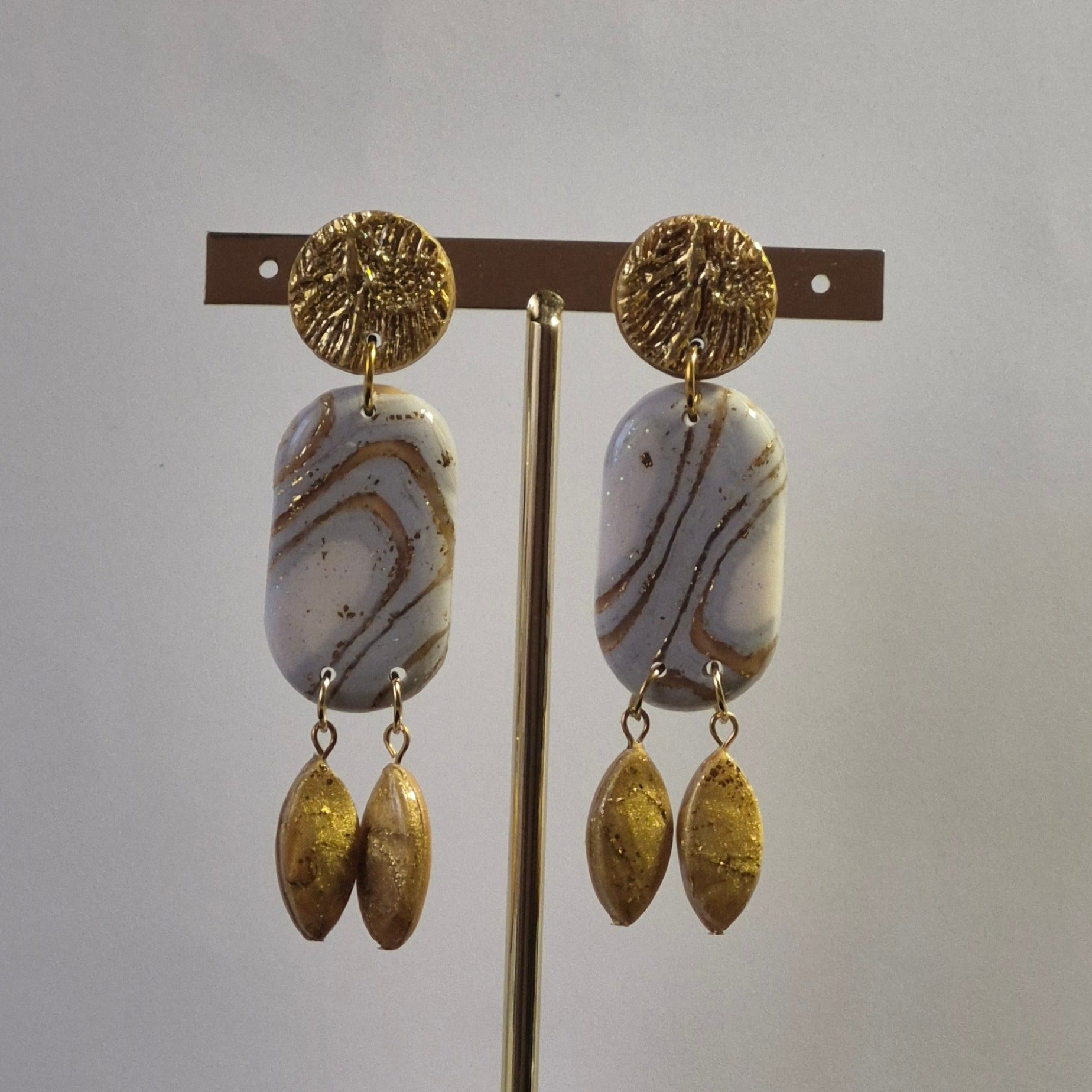 Pendientes elegantes con diseño inspirado en la naturaleza. La pieza central, en tonos blanco marfil con vetas doradas, imita la textura de la arena acariciada por el viento, mientras que los apliques inferiores en forma de semillas doradas añaden movimiento y sofisticación. El broche circular superior en tono oro viejo completa el diseño, otorgando un toque clÔsico y distintivo.