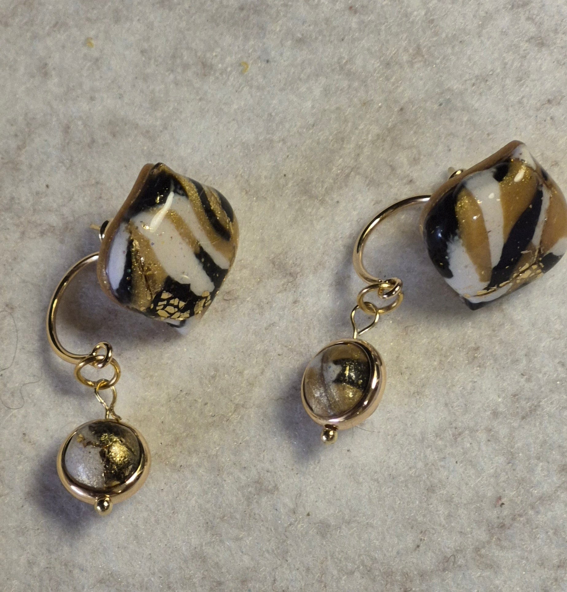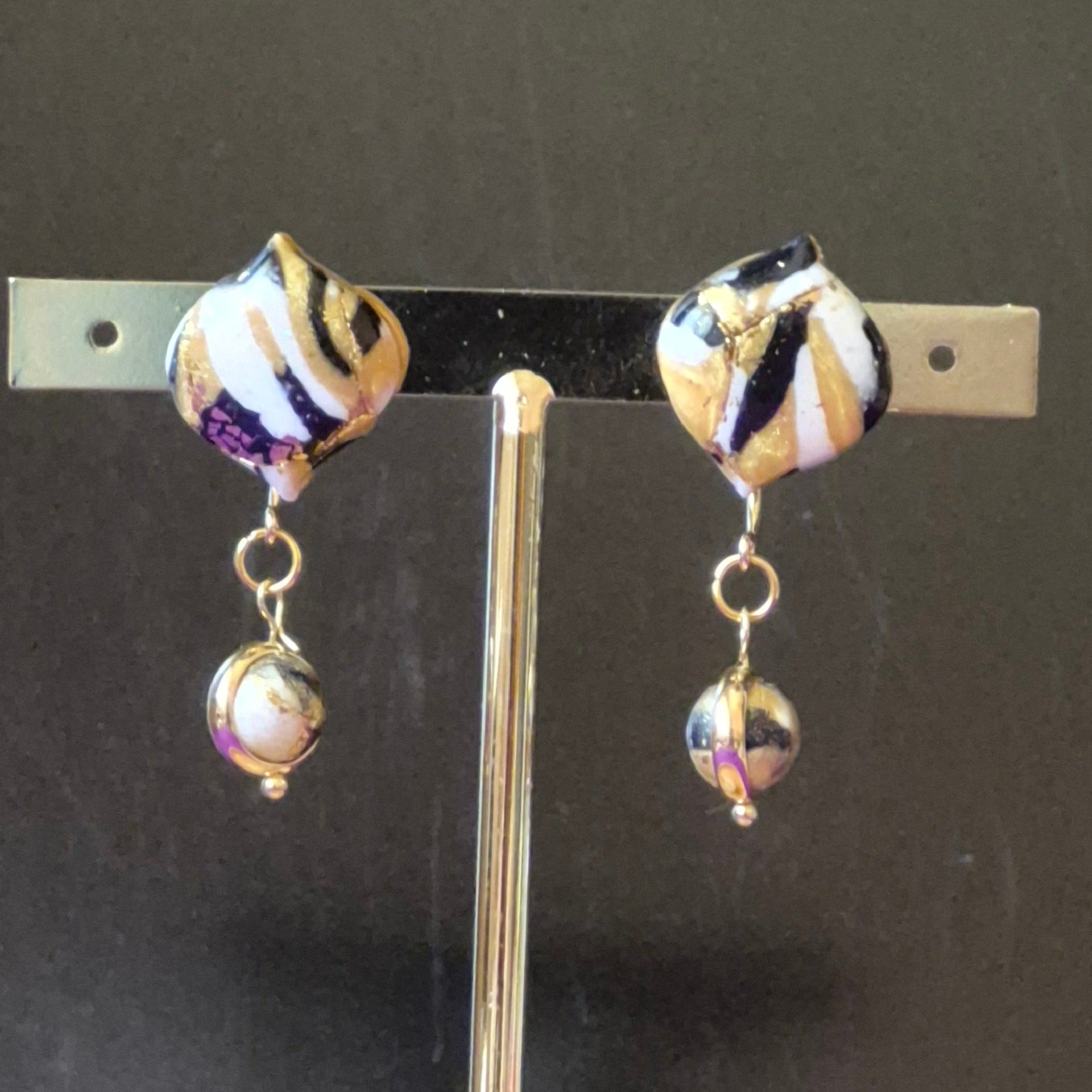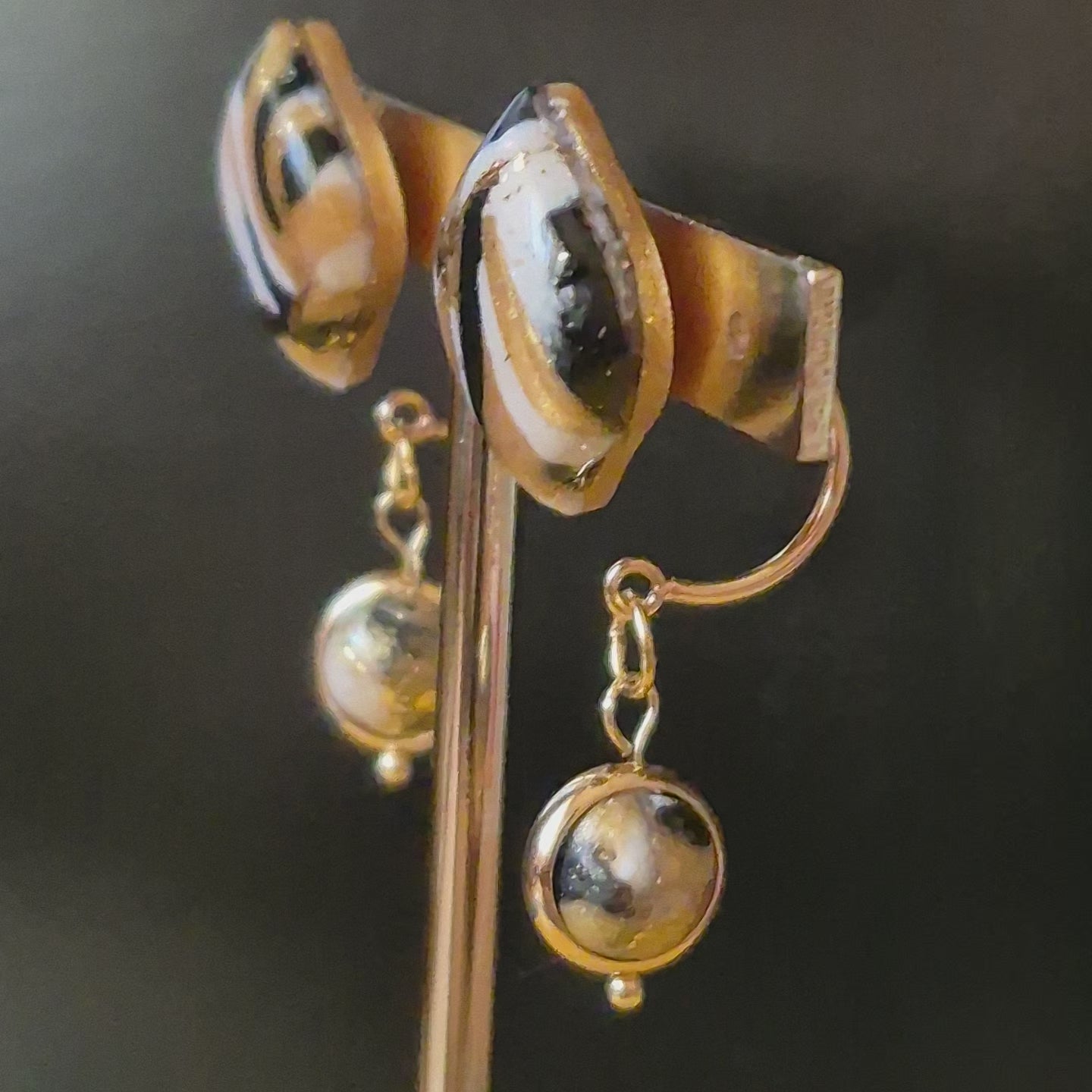 Pendientes únicos hechos a mano en arcilla polimérica con acabados en tonos negro, blanco y dorado, combinados con esferas metálicas que aportan un toque moderno y elegante.