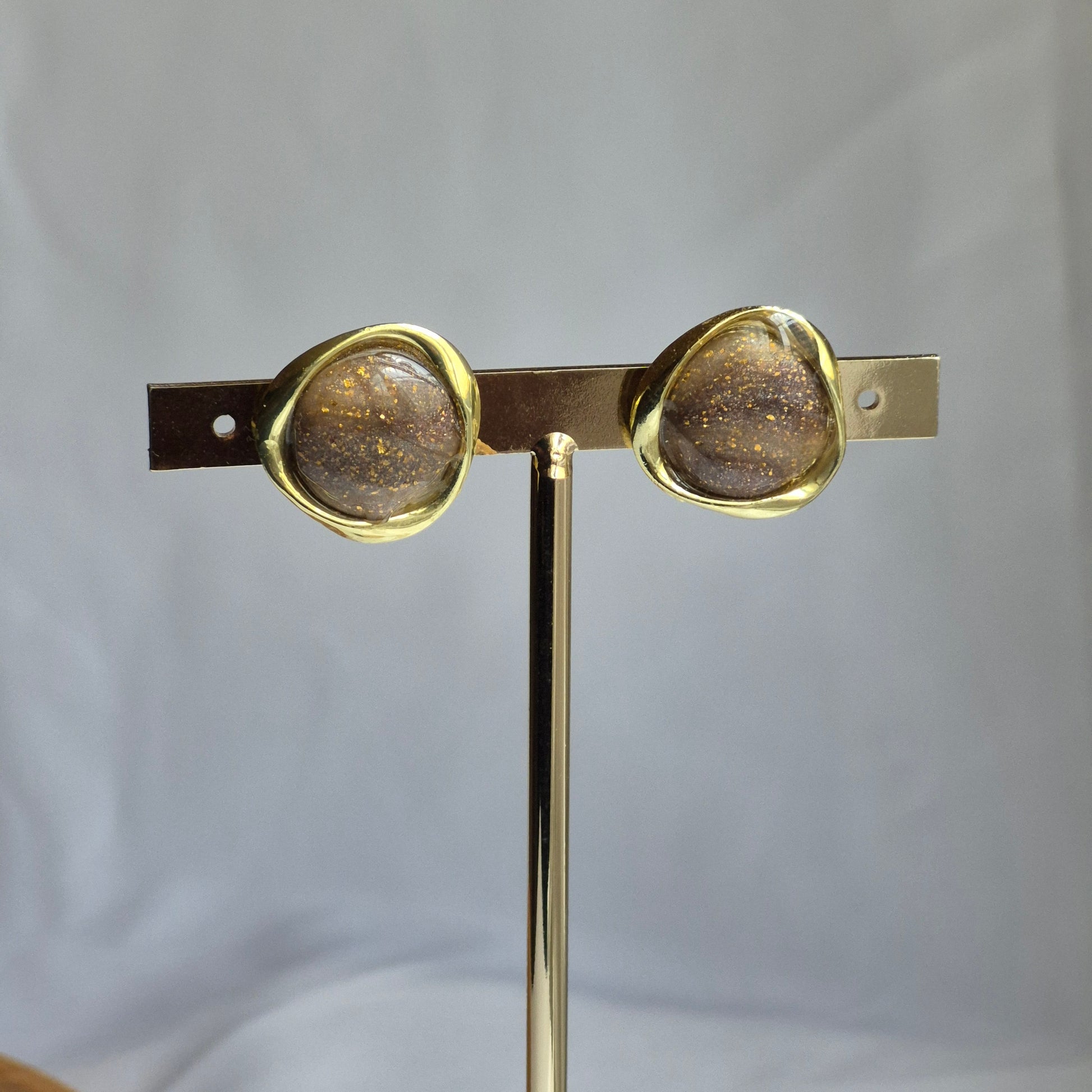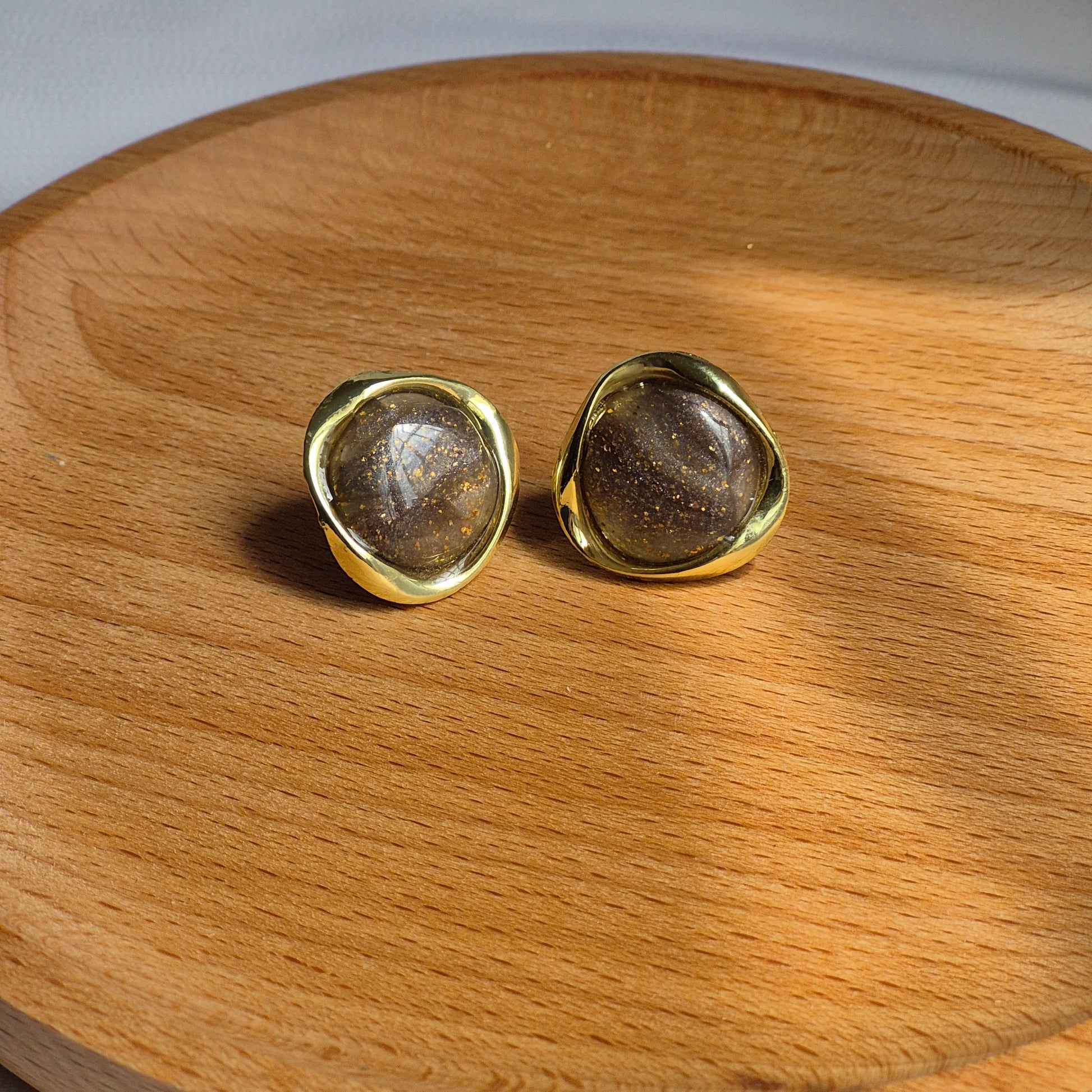 Los pendientes "Noche Dorada" están hechos a mano con arcilla polimérica en un tono marrón oscuro con sutiles destellos dorados, que evocan la calma y el misterio de una noche estrellada. Su forma redondeada, abrazada por una base metálica de líneas orgánicas en acabado dorado, los convierte en una pieza sofisticada y única.