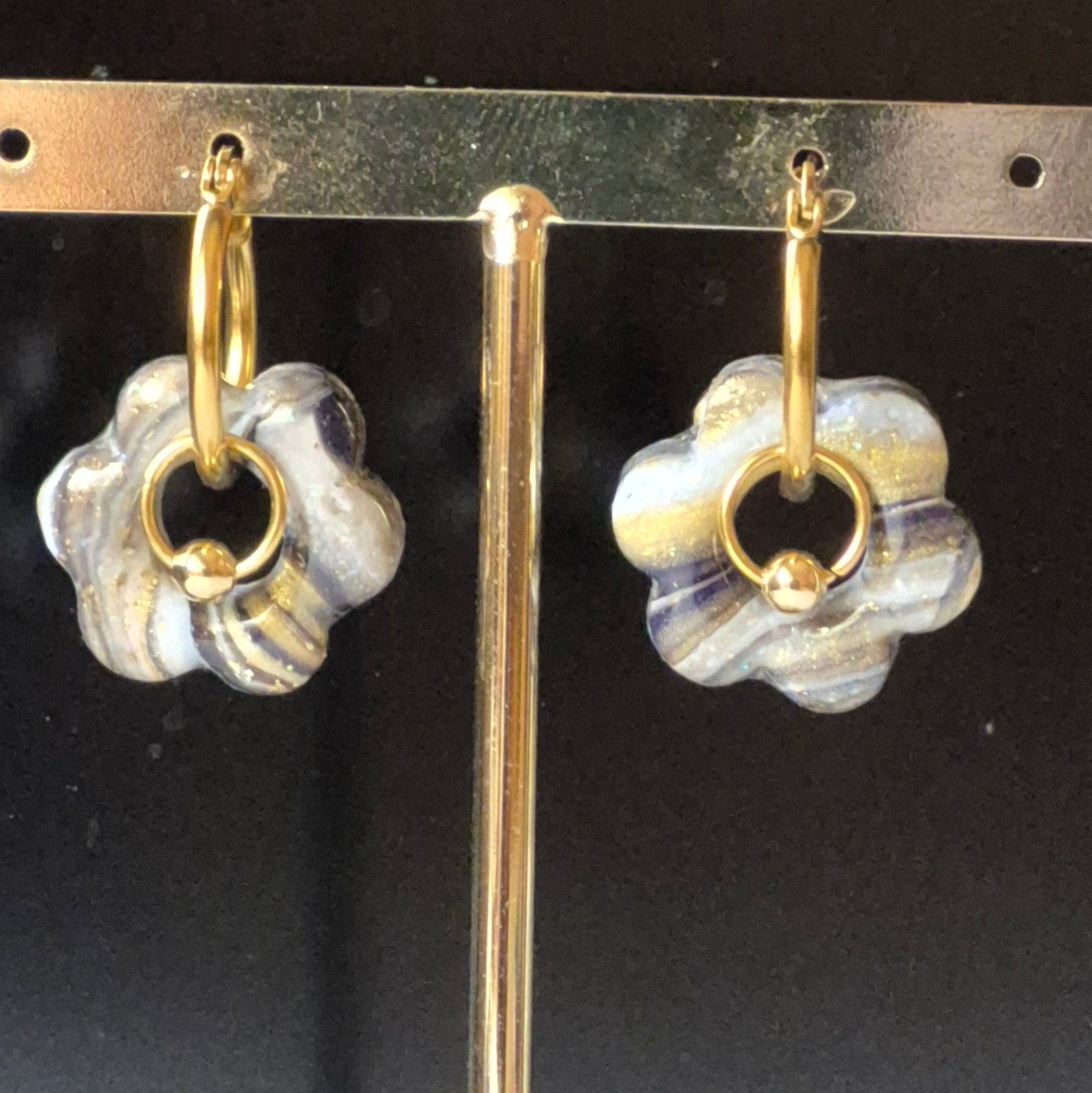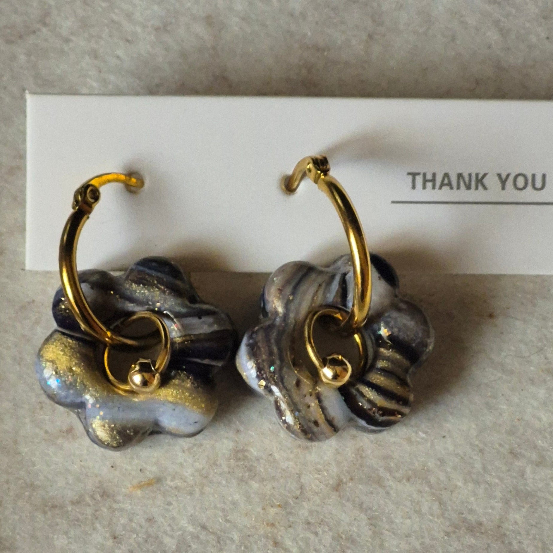 Descripción: Pendientes de aro en acero inoxidable dorado con dije en forma de flor, modelado a mano en arcilla polimérica con tonos plateados, negros y destellos dorados. Un diseño elegante y contemporáneo que combina la fuerza del contraste con la delicadeza floral, perfectos para elevar cualquier look.