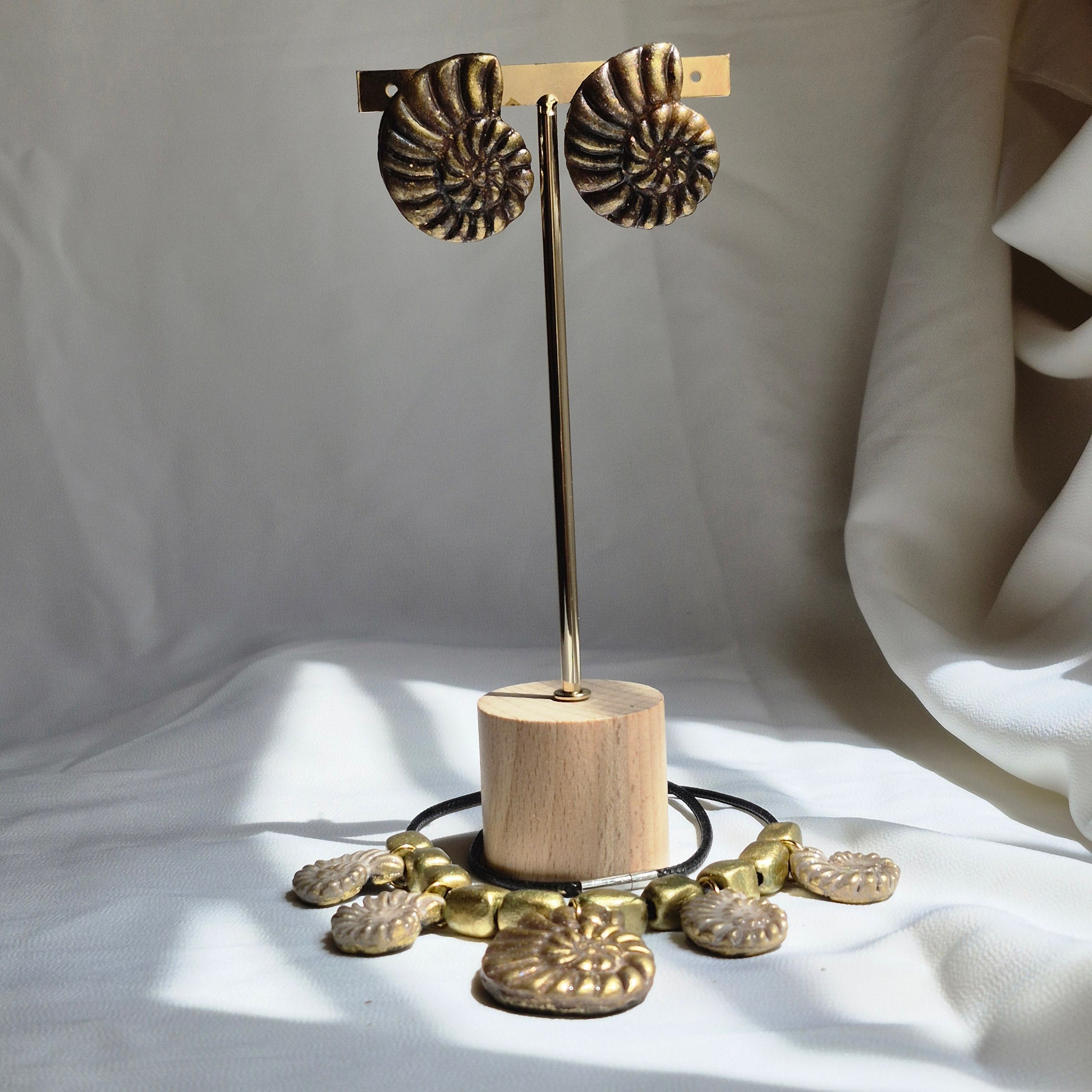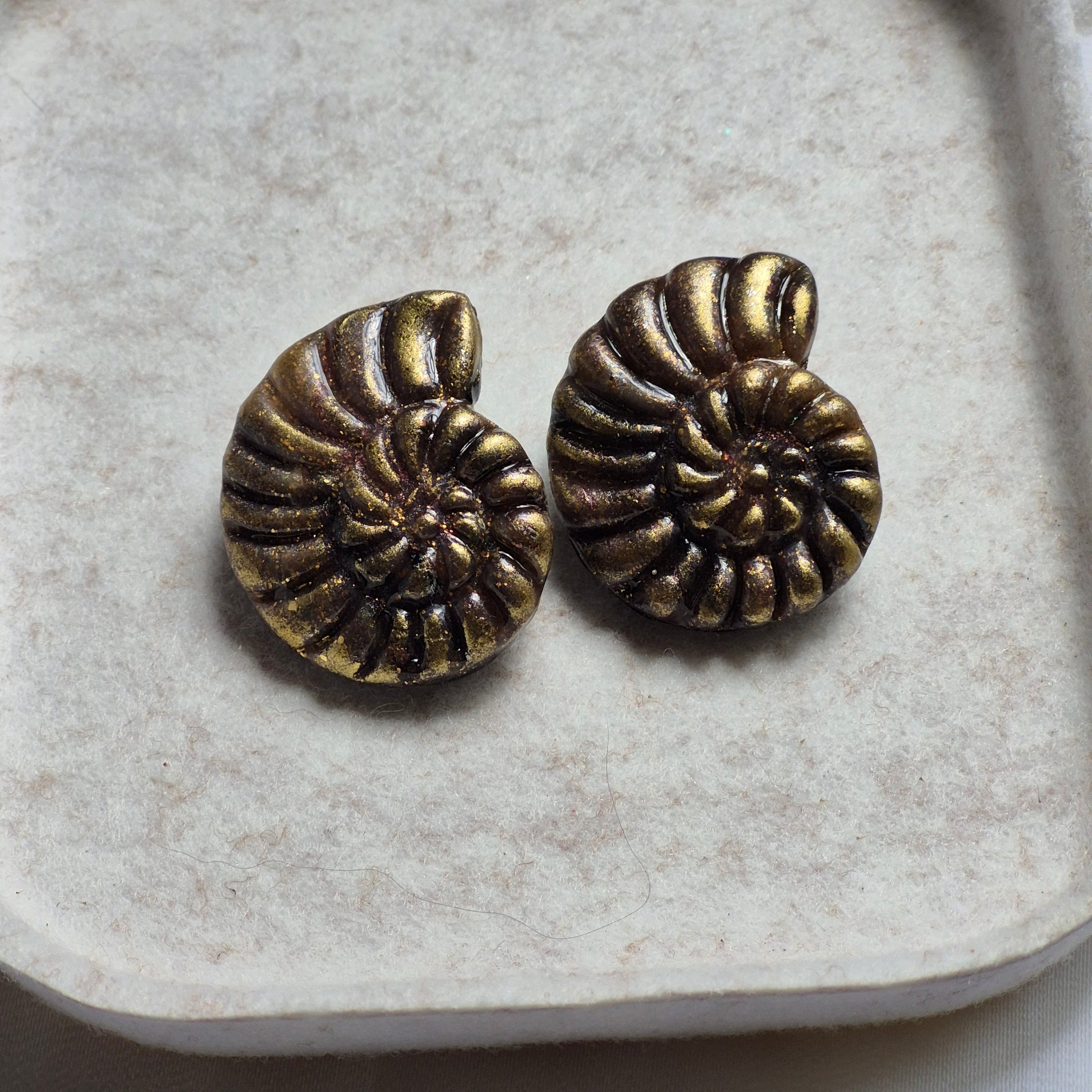 Inspirados en la belleza de los fósiles marinos, los pendientes "Fósil Dorado" están hechos a mano con arcilla polimérica y acabados en tonos metálicos dorado y bronce. Su textura en espiral imita la forma de un ammonite, creando una pieza elegante, única y con un aire antiguo que combina con estilos boho, vintage o sofisticados.