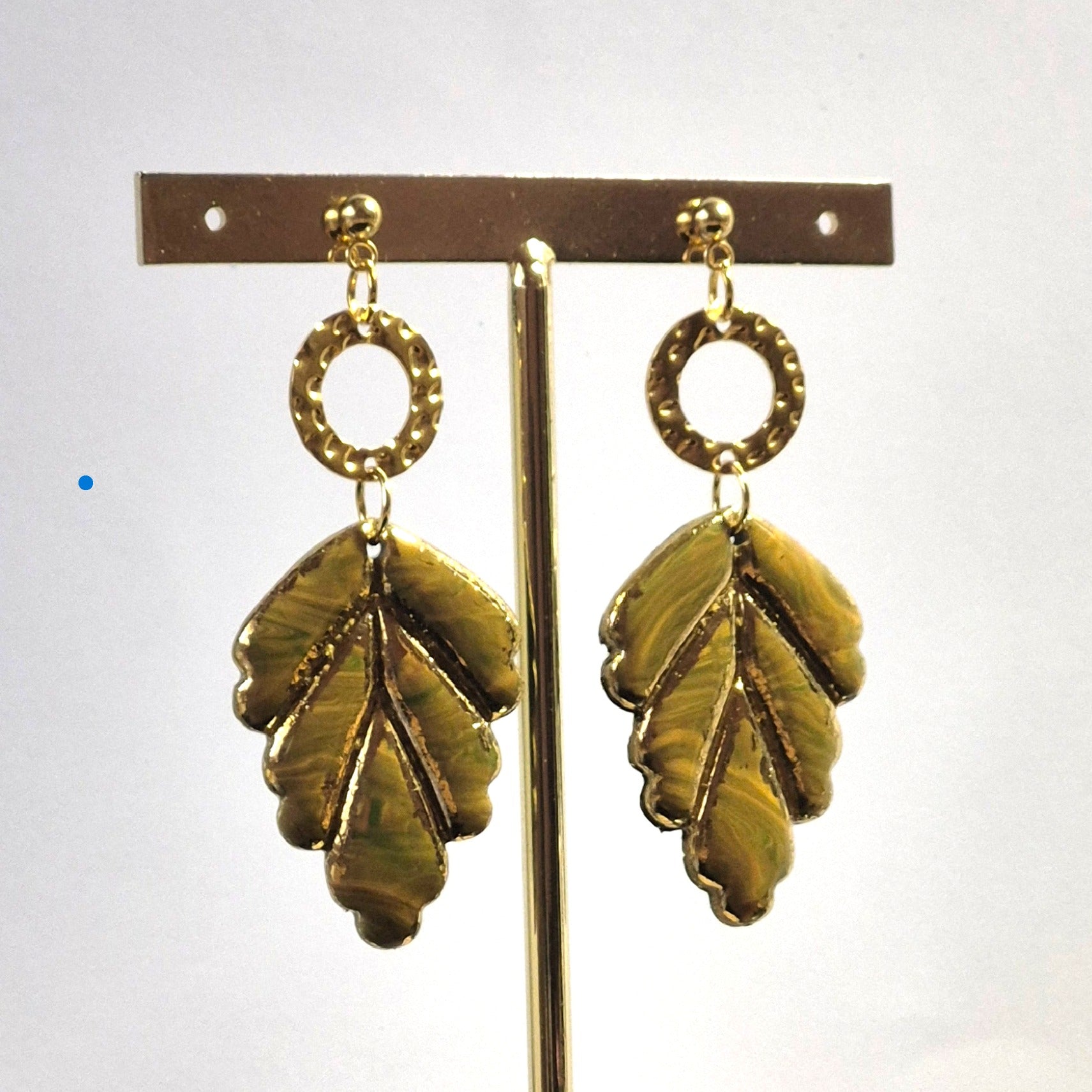 Pendientes artesanales elaborados en arcilla polimérica con acabado dorado, inspirados en la forma orgánica de las hojas. Incorporan un aro de acero inoxidable con textura martillada que aporta elegancia y durabilidad, evitando alergias y garantizando brillo permanente. Son ligeros y cómodos, perfectos para realzar un look natural con un toque sofisticado.