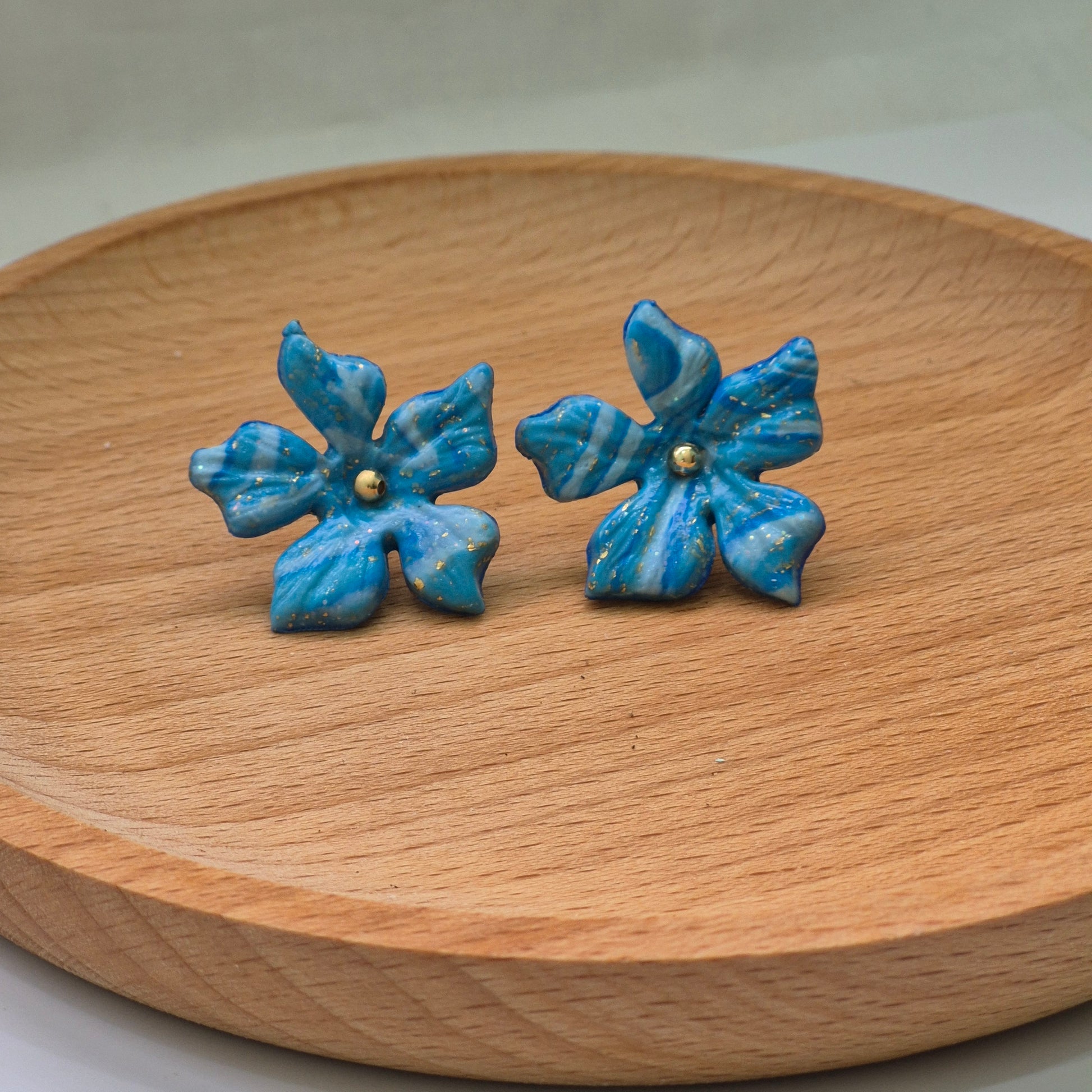 Pendientes en forma de flor artesanalmente moldeados en arcilla polimérica, con tonos azules y vetas doradas que evocan las olas del mar Mediterráneo. Su delicado diseño floral añade un toque fresco y elegante, ideal para resaltar en días soleados o noches especiales. Cada par es único, lleno de encanto y esencia marina. 🌊🌸✨