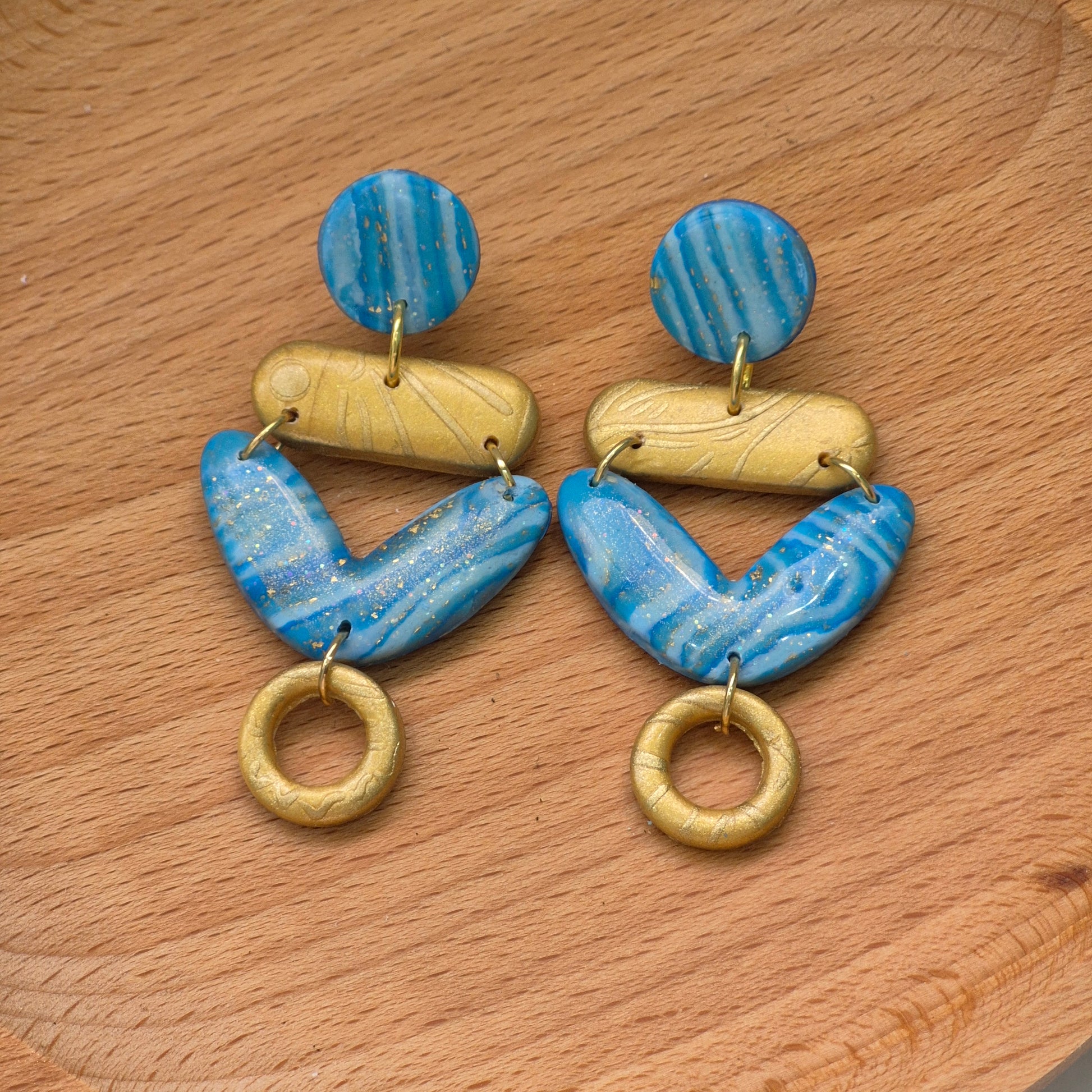 Pendientes hechos a mano en arcilla polimérica, inspirados en las profundidades del mar Mediterráneo y el dorado sol del sur. Los tonos azulados con vetas perladas evocan las olas suaves, mientras los detalles dorados recuerdan la calidez de la arena al atardecer. Un diseño lleno de movimiento, luz y esencia mediterránea.