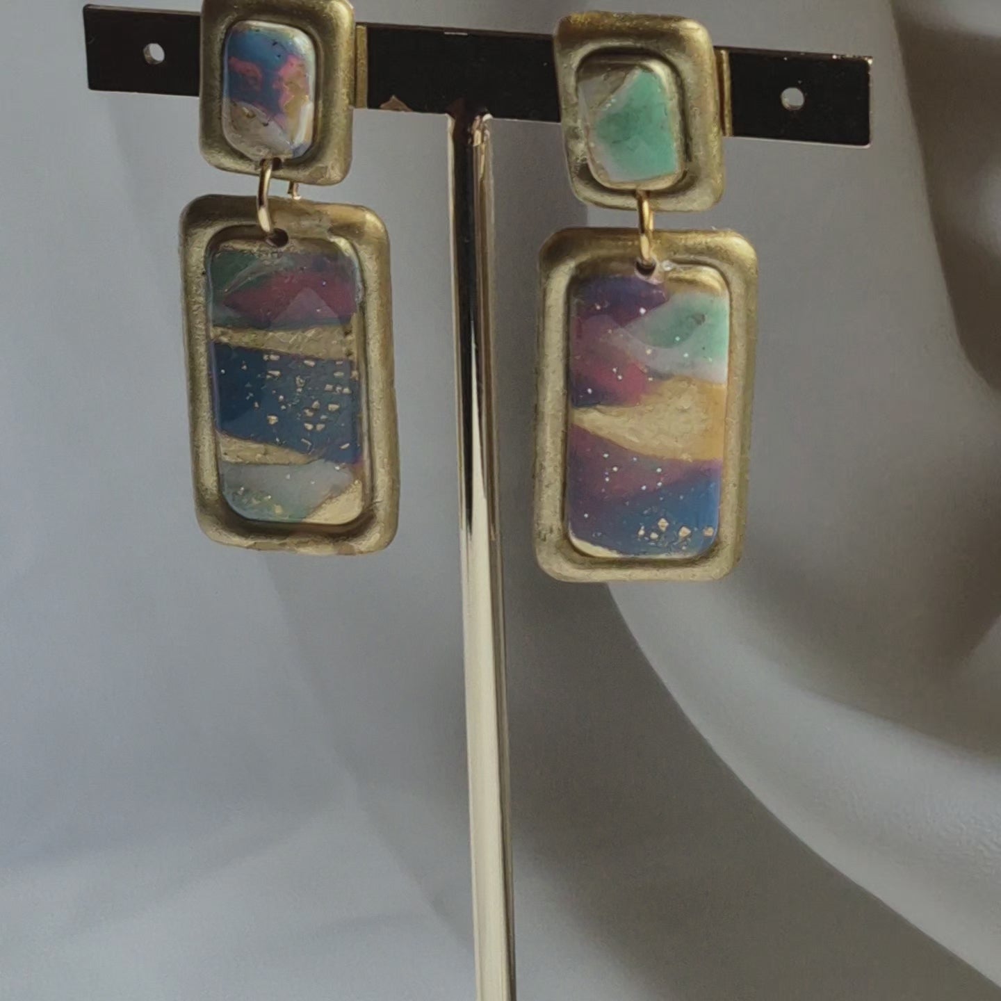 Pendientes artesanales elaborados con arcilla polimérica, inspirados en los mágicos colores de la Nube Dorada. Cada pieza presenta una mezcla de tonos turquesa, fucsia, dorado y azul profundo, protegidos por un acabado brillante y enmarcados con bordes dorados. El diseño rectangular colgante les da un aire elegante y moderno. Ideales para quienes buscan joyería única, artística y con personalidad.