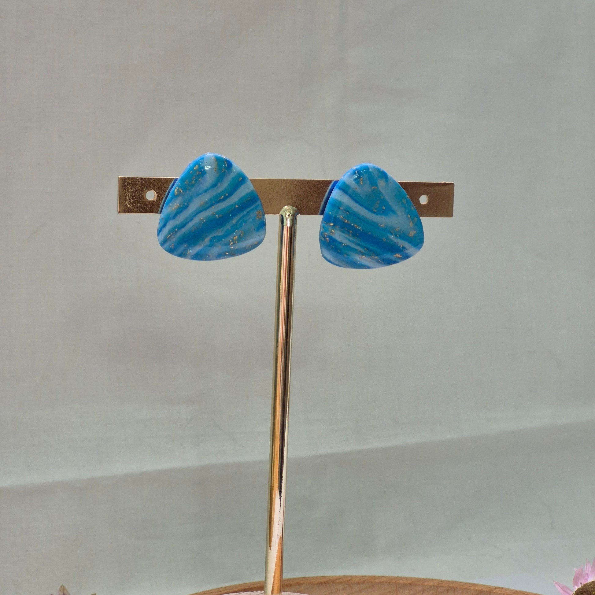 Luce el encanto del Mediterráneo con estos pendientes Isla Serena. Hechos a mano en arcilla polimérica, su diseño triangular en tonos azules con destellos dorados captura la esencia del mar y el sol. Son ligeros, cómodos y perfectos para añadir un toque fresco y cómodo a tu look diario o de verano.
