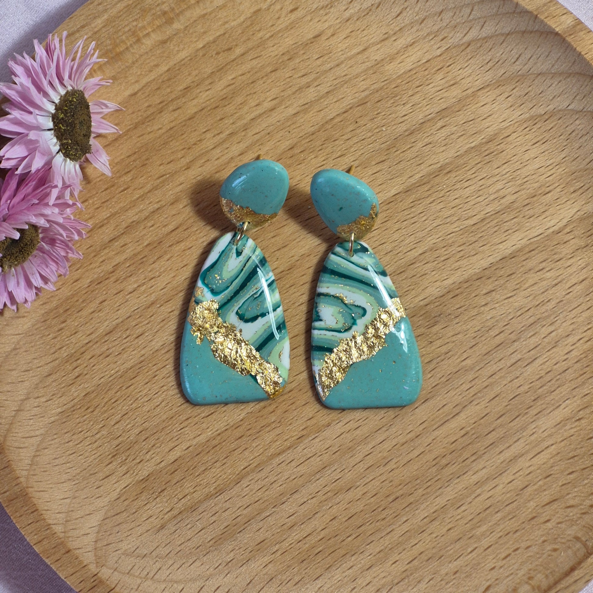 Elegantes pendientes colgantes hechos de arcilla polimérica, con un diseño en tonos verdes y detalles marmoleados en blanco y negro. La incorporación de vetas doradas añade un toque de sofisticación y lujo. Su forma geométrica moderna los convierte en un accesorio versátil, ideal para realzar cualquier atuendo con estilo y distinción.