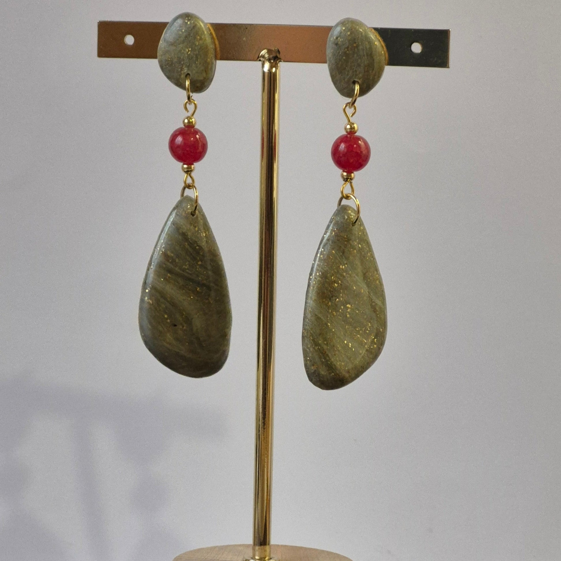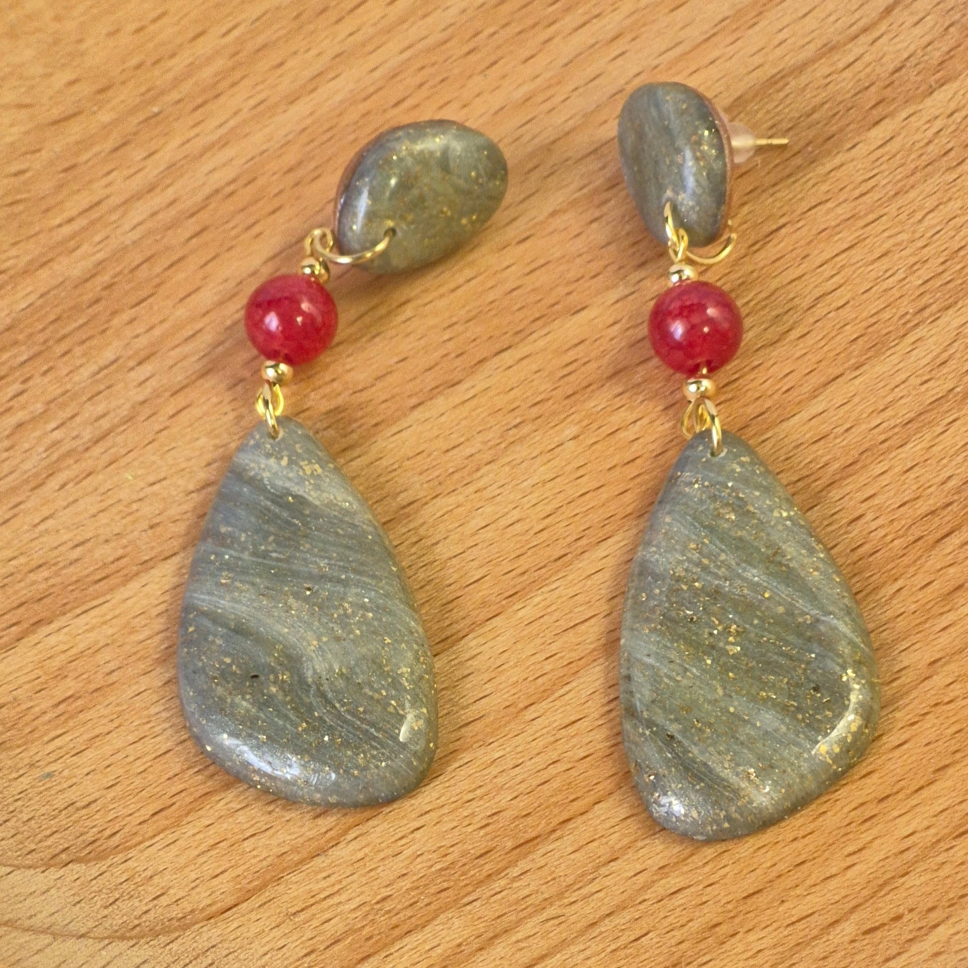 Pendientes artesanales elaborados en arcilla polimérica con acabado efecto piedra natural en tonos verde musgo con vetas doradas. El diseño en forma de gota se complementa con una cuenta de cristal rojo carmesí, que aporta un toque vibrante y elegante.