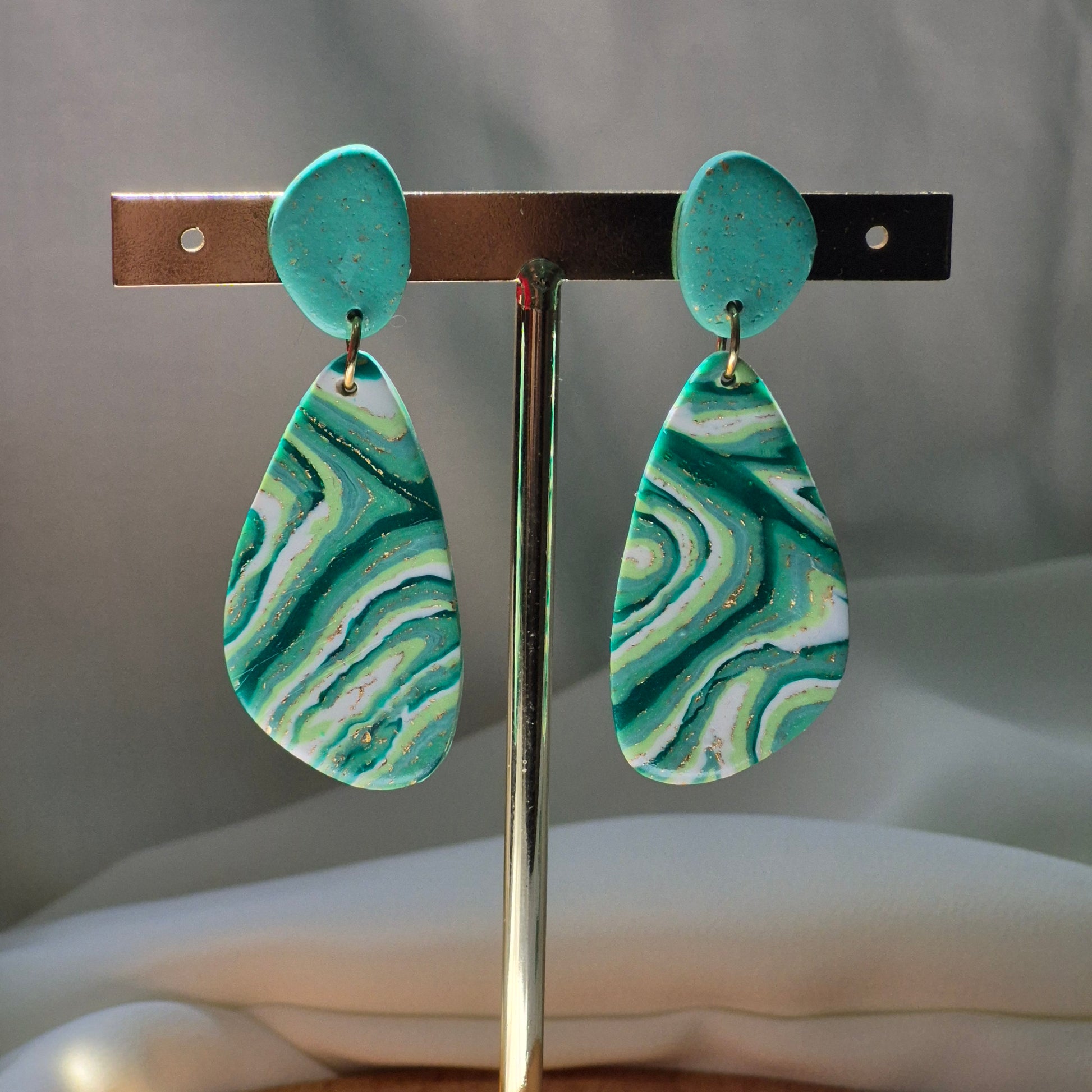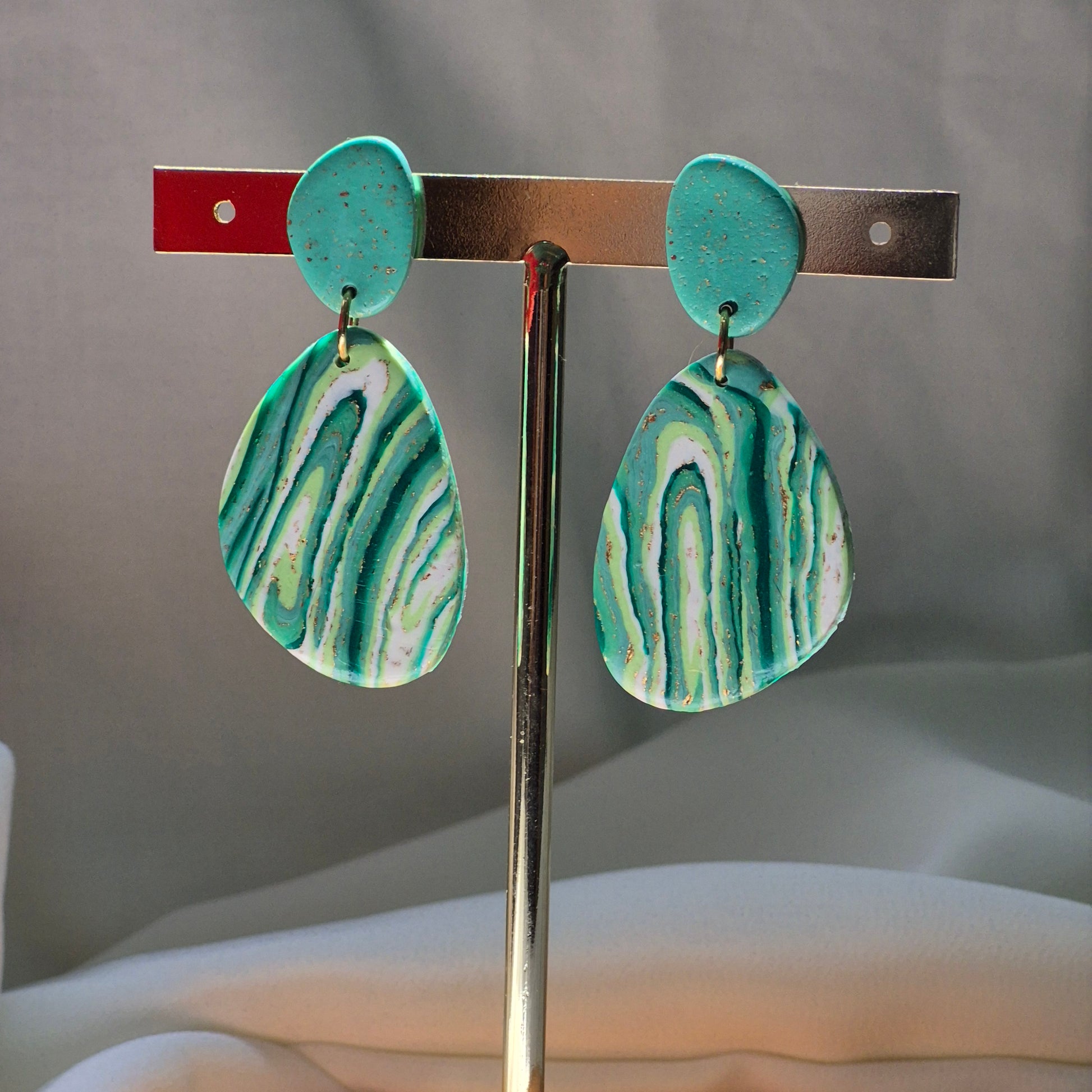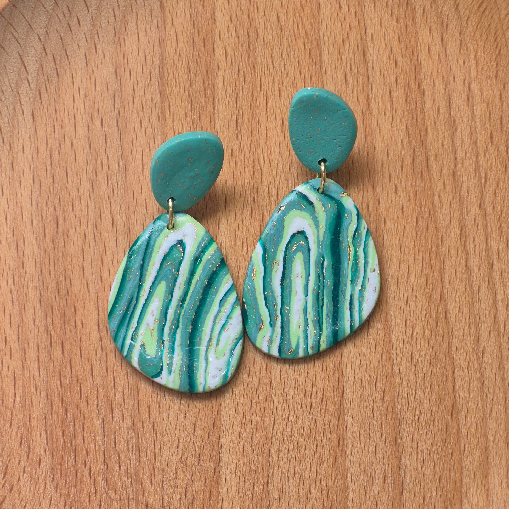 Inspirados en las formaciones naturales y la fuerza de la tierra, los pendientes "Selva Mineral" están hechos a mano con arcilla polimérica y presentan un diseño que simula vetas minerales en tonos verdes, jade, blanco y suaves toques dorados. Su forma orgánica de lágrima invertida y el acabado mate aportan un estilo elegante y natural.