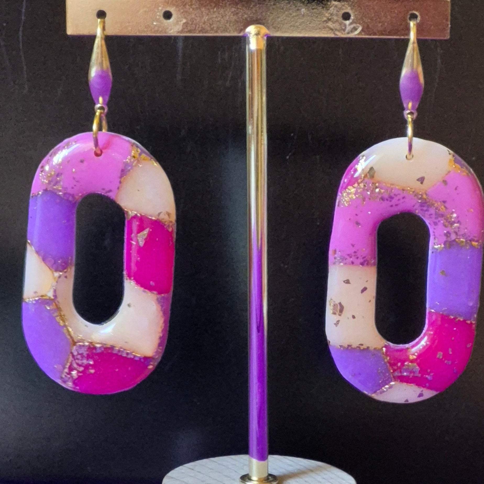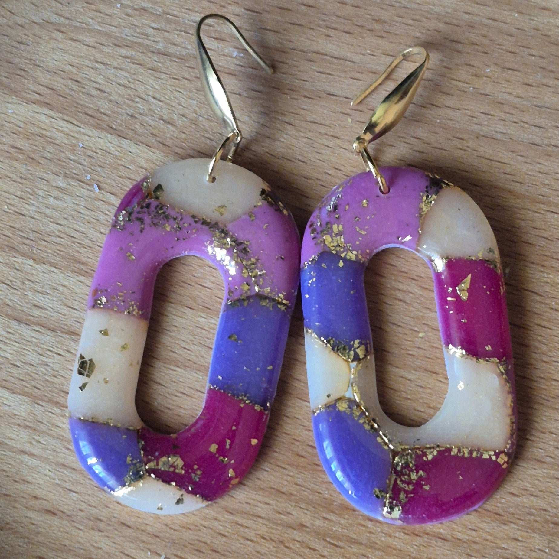 Los pendientes Aurora están inspirados en los tonos mágicos del amanecer: morado, fucsia y blanco, fusionados con destellos dorados que evocan un cielo pintado de luz. Hechos a mano en arcilla polimérica y montados en acero inoxidable, son ligeros, resistentes y únicos. Su diseño geométrico con forma ovalada aporta un estilo moderno y vibrante, perfecto para quienes buscan destacar con un accesorio lleno de energía y color.